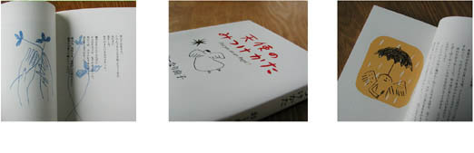 見えないことが多い天使だけれど、運良く見かけることがあります。 天使の姿は、見る人によっていろいろに見えるのだそうです。 一本の桜の木でも見る人によって、大きく美しいものに見えたり、 さびしくてこわいものに見えたり、小さくてつまらないものに見えたりするのと同じで、 天使もその人の感じ方によって、いろいろに見えるようです。 ──(本文「天使のかたち」より抜粋「天使のみつけかた」/絵と文/1992年/144P/大和書房刊(99年新潮文庫180P) 左上から/カバー(左文庫、右単行本)/(単行本)別丁扉/(単行本)本文、 左下から/文庫「人間になりたかった天使の話」 /文庫カバー/文庫「あめふり天使」 |
